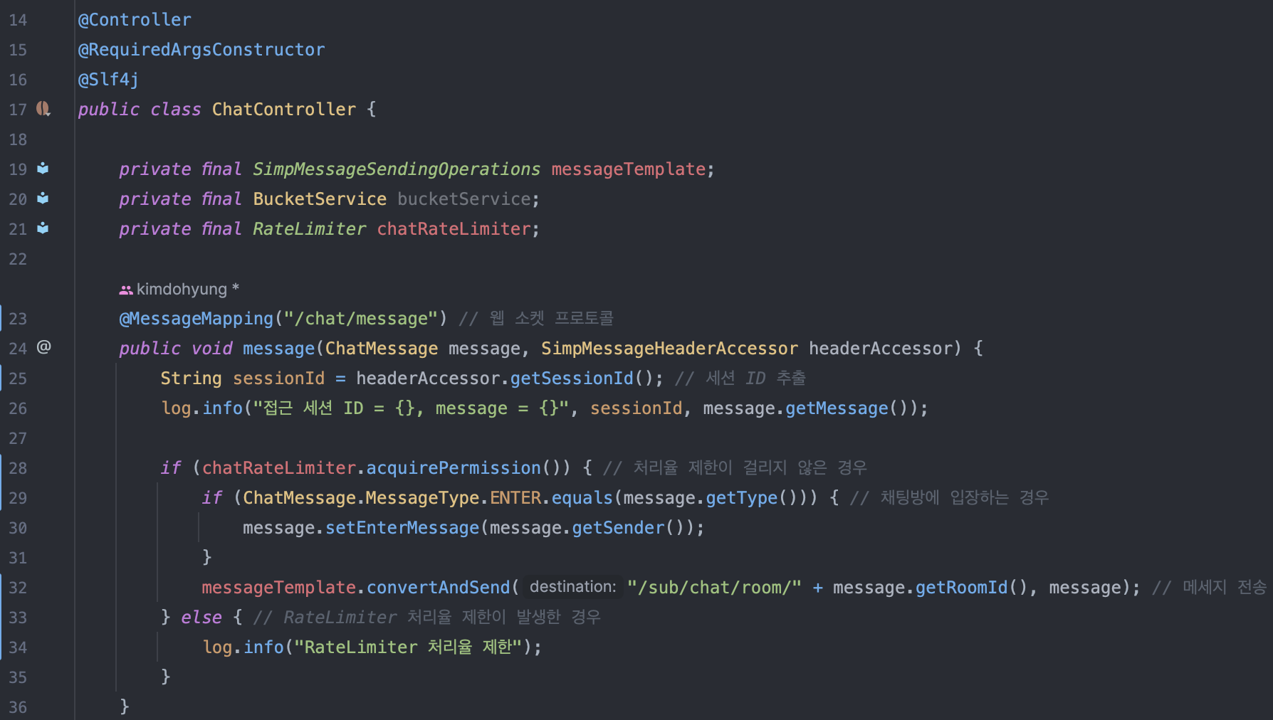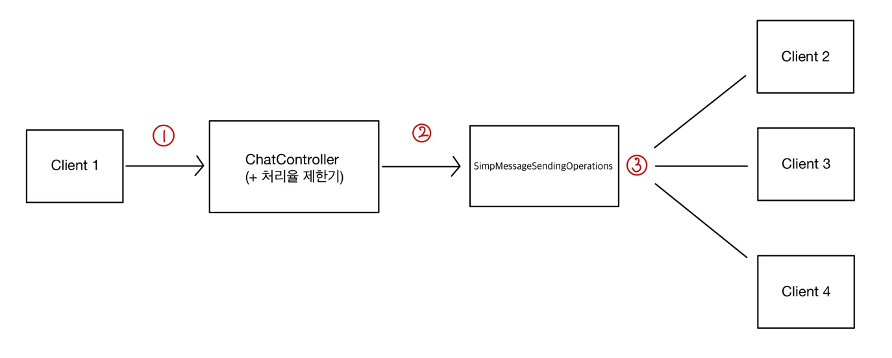 2. ChatController에서 메시지는 처리율 제한기 로직을 거치고 SimpMessageSendingOperations에 넘긴다.