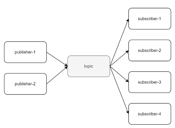 해당 그림을 살펴보면 발행-구독 매커니즘으로 특정 주제에 메시지를 보내면, 해당 주제를 구독하고 있는 subscriber 모두에게 메시지가 전달되는 구조다.