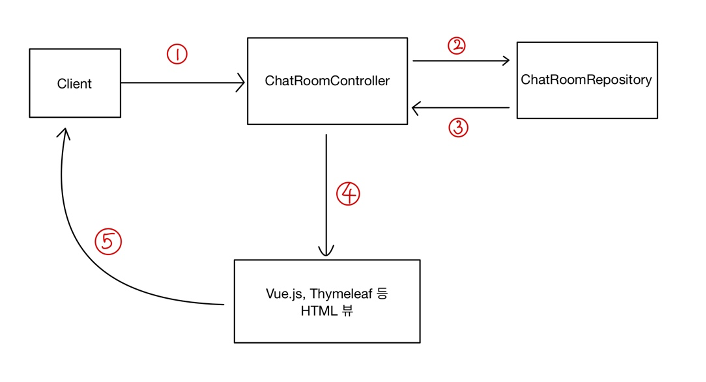 4. ChatRoomController는 가져온 데이터를 클라이언트한테 반환한다. 이때 Vue.js나 Thymeleaf 등의 뷰 템플릿 엔진을 사용하여 데이터를 HTML로 변환한다.