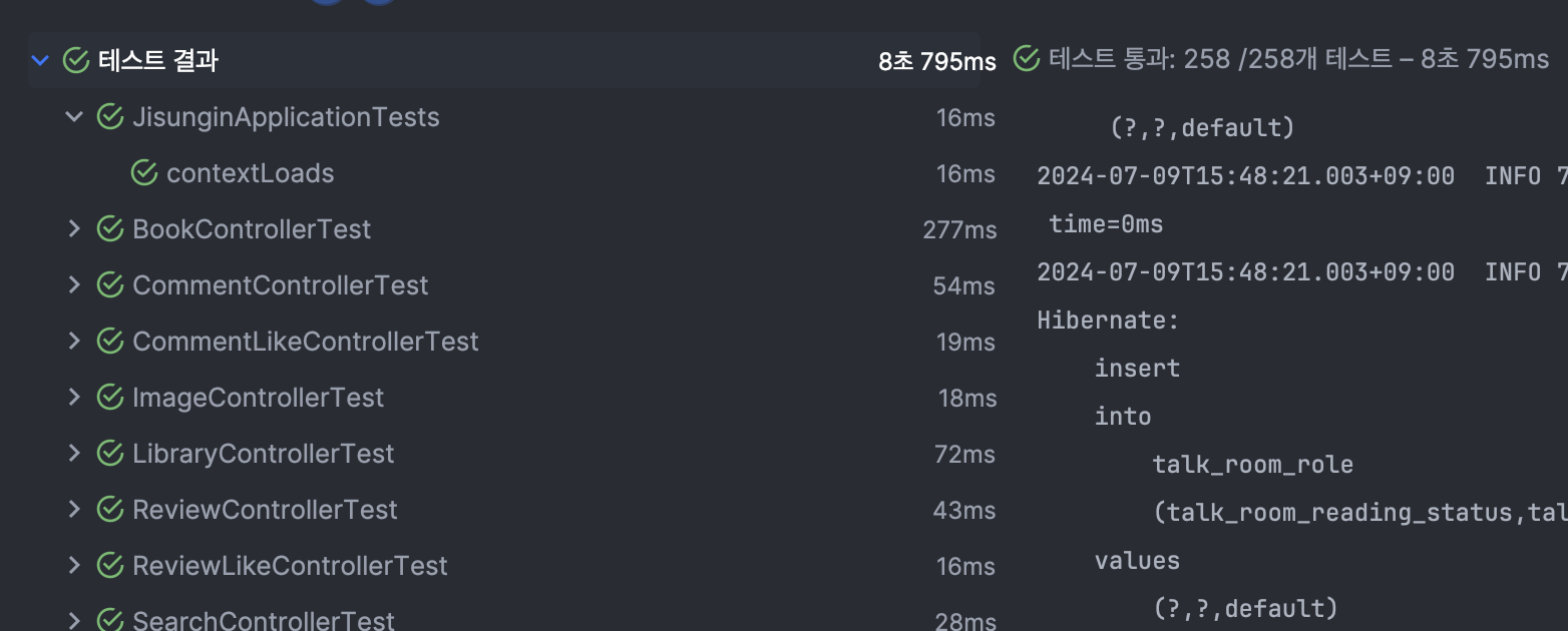 추가적인 기능 개발과 리팩토링을 했더니 단위 테스트도 늘어나서 55개가 늘어난 258개가 되었다.