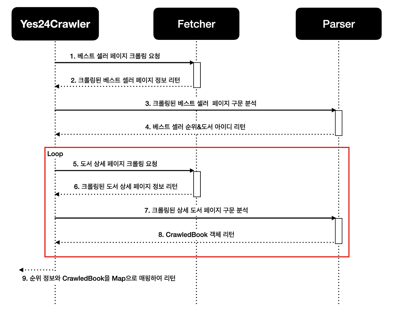 해당 코드는 parser.parseBestSellerIds(...) 메서드로 100권의 도서 id를 가져와서, 다시 상세 도서 정보를 크롤링하여 순위 정보와 함께 Map으로 매핑하여 리턴해준다.